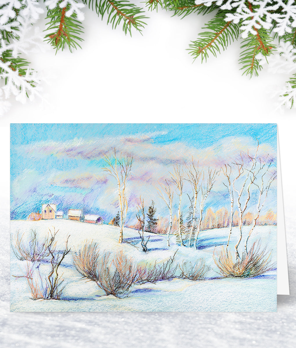 This sunny winters day landscape captures the nuanced interplay of light and shadow unique to winter afternoons. The front of this design cannot be personalised. This card has a light sheen finish on the front and a matt finish inside and the personalisation is printed directly to the card. The cards measure 148.5 x 210mm (A5) when folded and post with standard Royal Mail Letter Size postage. They are supplied with quality white peel and seal envelopes. If you would like to order a free non personalised sample of this card before you order then please click here